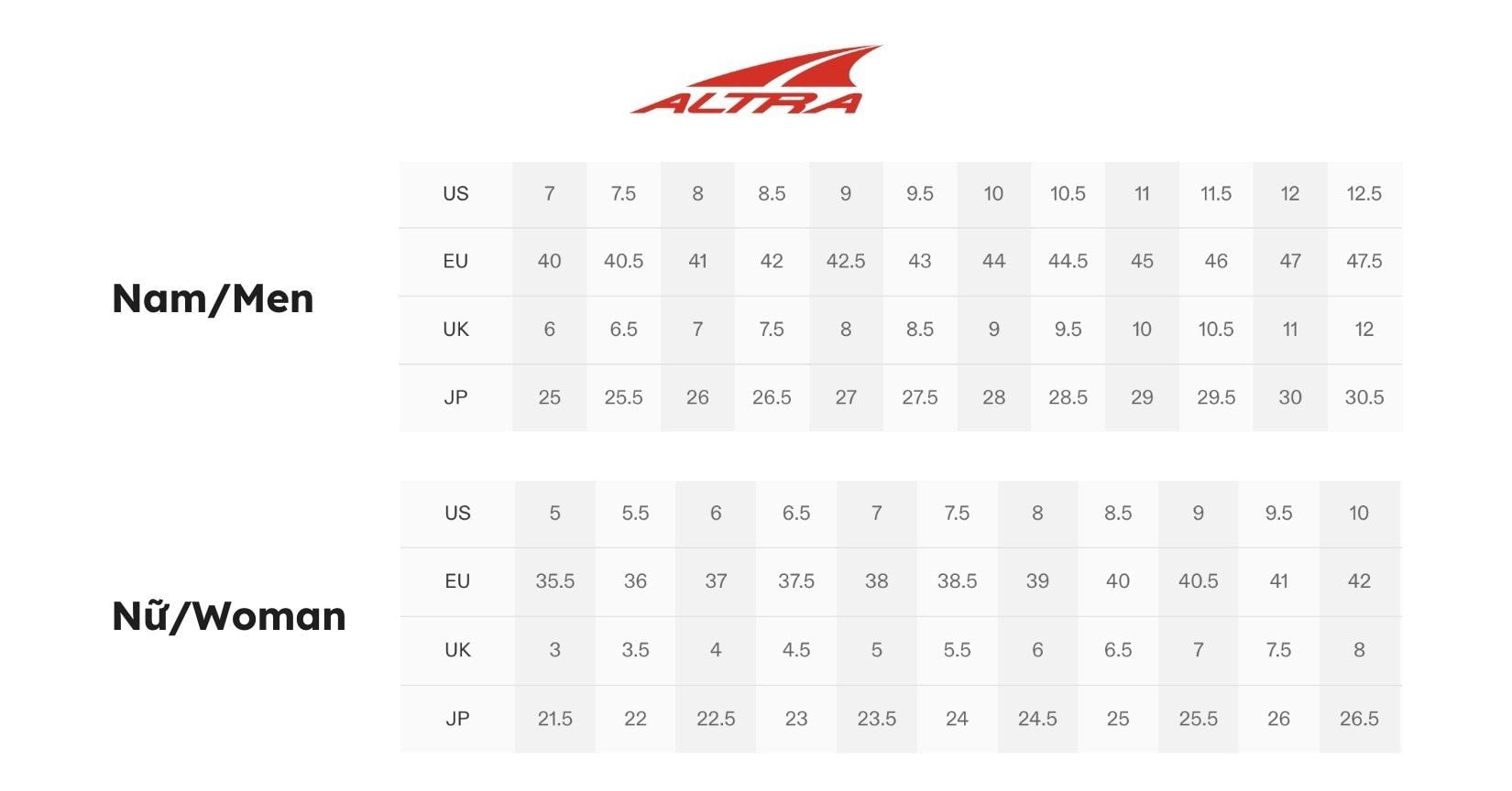 Để chọn được kích cỡ giày phù hợp với đôi chân của bạn, hãy tham khảo bảng hướng dẫn chọn size dưới đây: