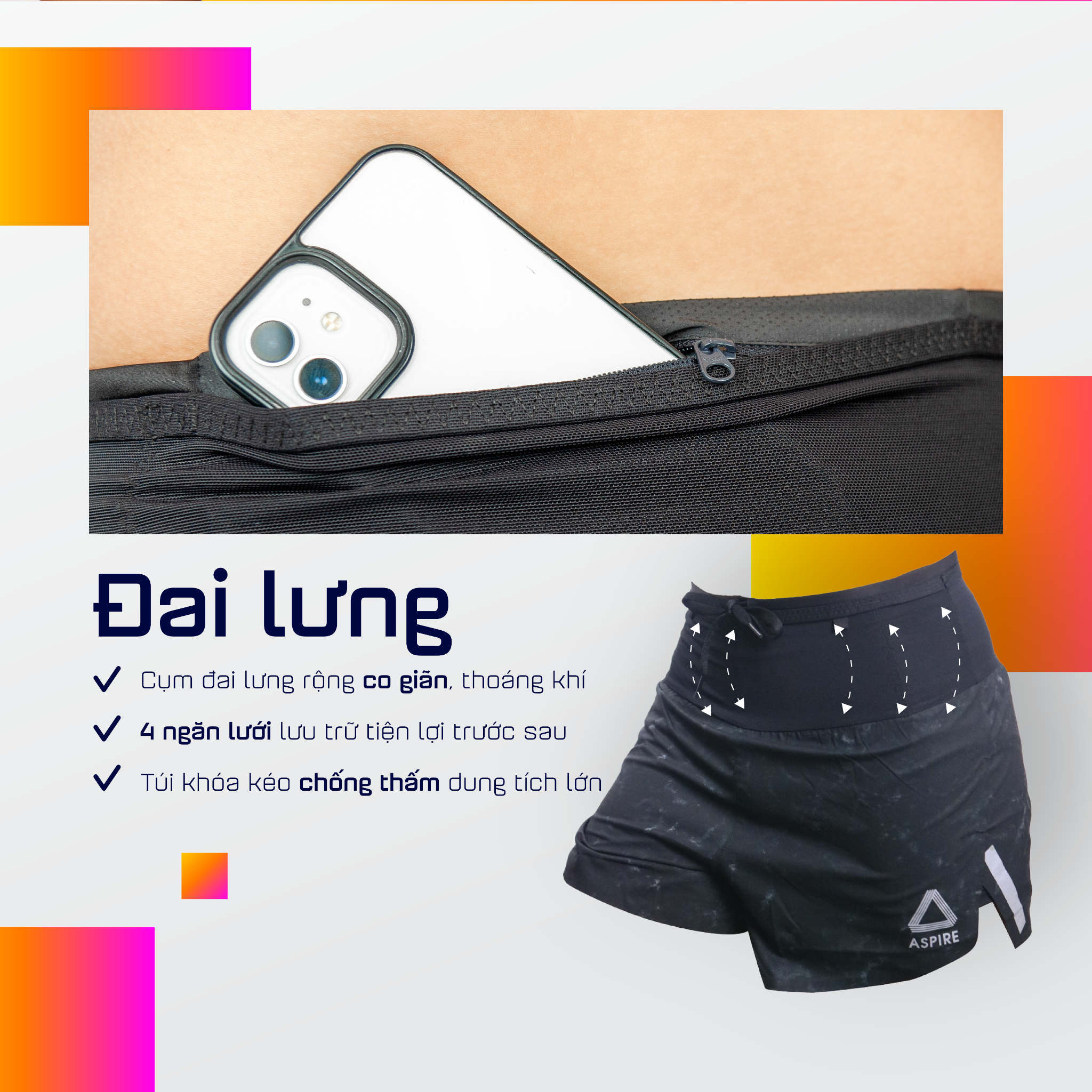 Một trong những điểm cộng lớn của Quần Short Chạy Bộ Aspire APQ602 Đa Năng là túi khoá kéo kín phía sau bên trong đai lưng. Đây là nơi lý tưởng để bạn bảo quản điện thoại, giúp bạn yên tâm hơn khi chạy bộ hoặc tham gia các hoạt động thể thao khác.