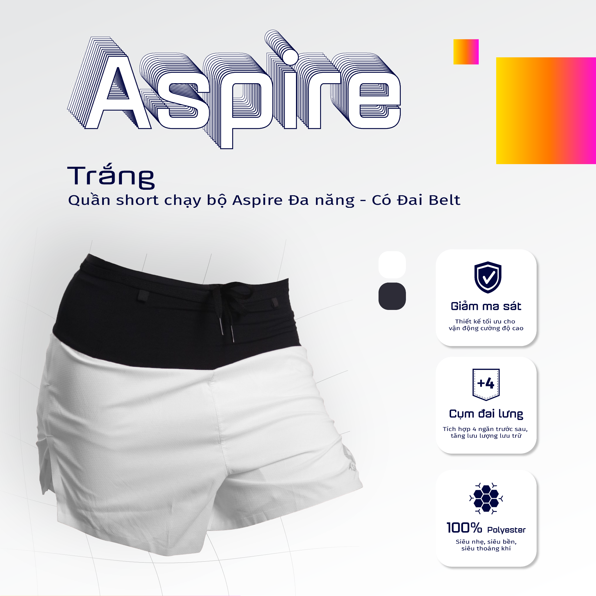 Giới thiệu tổng quan Quần Short Chạy Bộ Aspire APQ632 Đa Năng, Có Đai Belt - Trắng