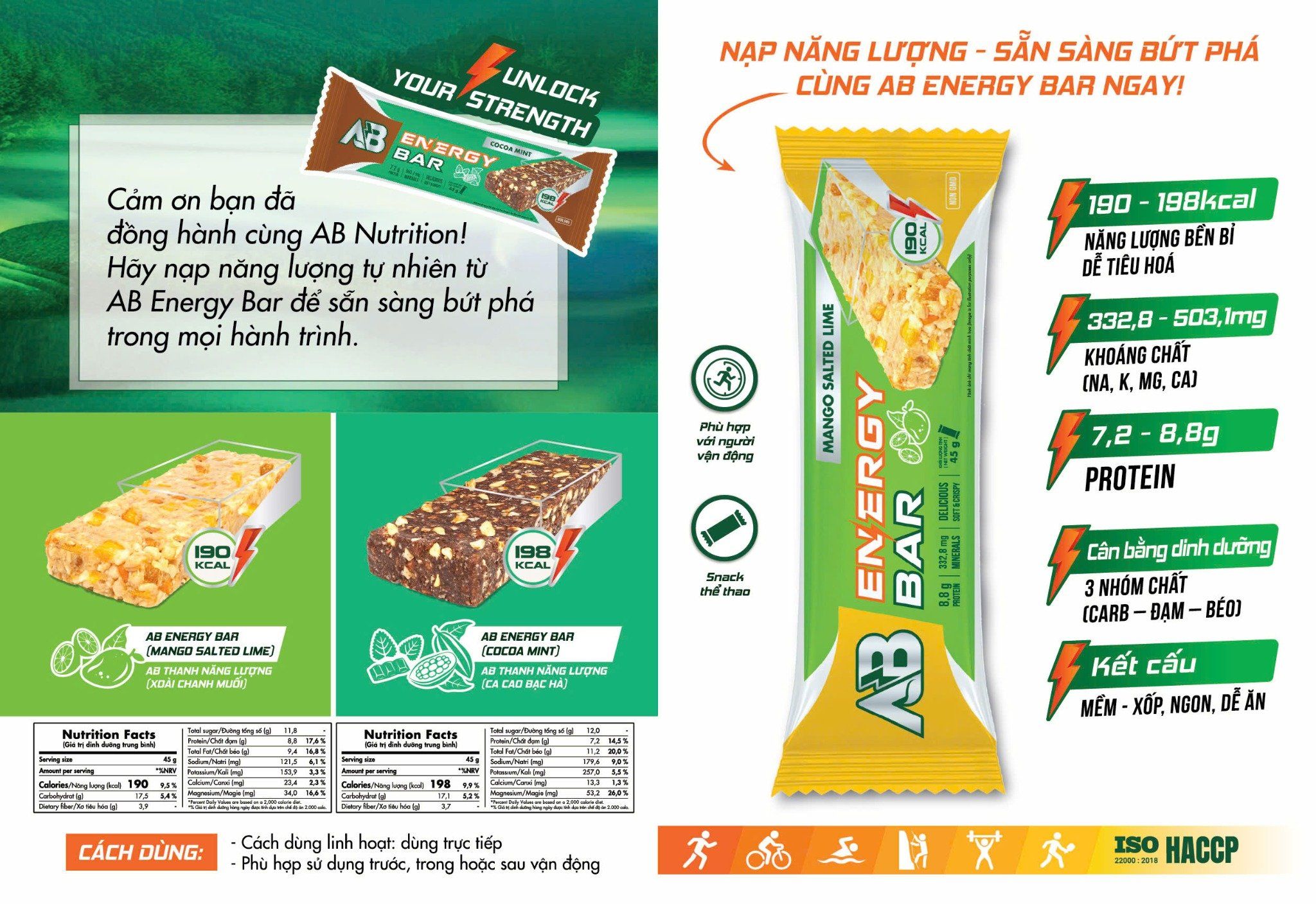- Đa dạng hương vị: Ngoài vị Cacao Bạc Hà, AB Energy Bar còn có Xoài Chanh Muối, Việt Quất, Macca... phù hợp cho mọi sở thích.