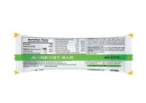 Chỉ với một thanh 45g nhỏ gọn, bạn đã có thể nạp đủ năng lượng cho cả buổi sáng, cho một buổi tập hoặc giữa giờ làm việc căng thẳng. AB Energy Bar – Xoài Chanh Muối được thiết kế để cung cấp năng lượng tức thì, giúp duy trì thể lực, cải thiện độ tập trung và giảm cảm giác mệt mỏi. Nhờ sự kết hợp cân bằng giữa carbohydrate, protein và chất béo tốt, thanh năng lượng này giúp cơ thể hấp thụ dinh dưỡng hiệu quả mà không gây nặng bụng. Đây là giải pháp hoàn hảo cho những ai bận rộn nhưng vẫn muốn duy trì lối sống lành mạnh.