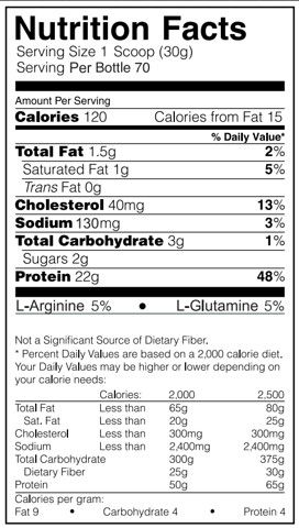 Chiết xuất protein whey có thành phần gồm hỗn hợp protein (Whey Protein Isolate, Whey Protein Cô đặc, Protein Peptide). Sản phẩm còn chứa một số axit amin thiết yếu, bao gồm L-Leucine, L-Isoleucine, L-Valine, Hương liệu, Dextrose, L-Arginine 5%, L-Glutamine 5%, Sucralose nhằm hỗ trợ phục hồi cơ bắp sau tập luyện, giảm tình trạng mệt mỏi cơ bắp và chống dị hóa cơ bắp sau tập.