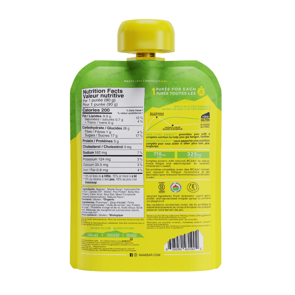 Táo*, xi-rô phong*, bột yến mạch thủy phân*, Dầu hạt cải*, Nước, Protein đậu*, Protein gạo lúa mạch, Axit citric, Muối biển, Chất chống oxy hóa tự nhiên (tocopherols hỗn hợp), Hương vị tự nhiên*. Chứa: Gluten. *Hữu cơ